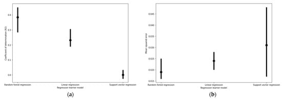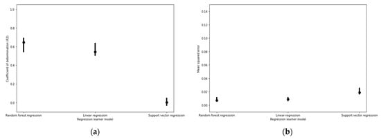 Filament diameter regression model performance based on (a) coefficients of determination (R2) and (b) mean squared error (MSE) values under fivefold cross validation. The upper and lower bounds of the error plots represent the maximum and minimum R2 and MSE values produced amongst all five combinations of one fold being trained and tested on the remaining four folds.