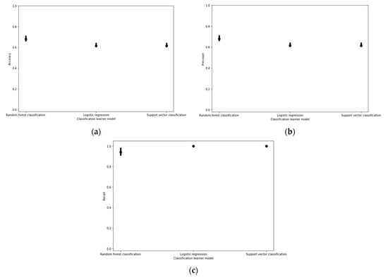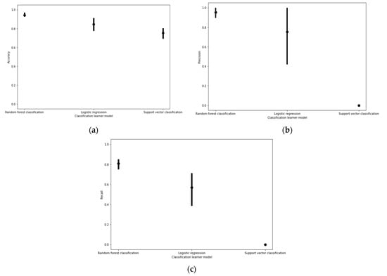 Filament diameter classification model performance based on (a) accuracy, (b) precision, and (c) recall scores under fivefold cross validation. The upper and lower bounds of the error plots represent the maximum and minimum scores produced amongst all five combinations of one fold being trained and tested on the remaining four folds.