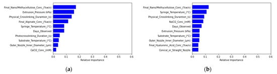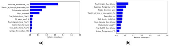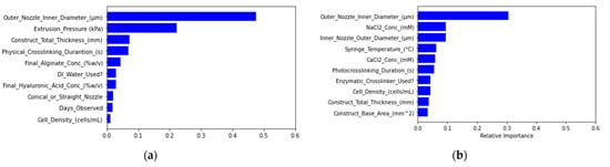 Compared to other ML models created for bioprinting predictions, the regression models created in this study provided lower R2 values and comparable errors with a similar proportion of training data to test data, and the accuracy of the classification models were lower as well [,]. A major reason for this is the difference in experiment variation for the datasets used to create the models. Input parameters gathered from published studies contained a limited number of independent variables due to the chosen experimental design, which focused on answering a specific research question versus parameter optimization. In addition, our dataset is inherently heterogeneous due to being acquired from studies conducted using different testing conditions and printing strategies. Comparatively, past studies contained larger amounts of data collected from controlled experimental settings []. Not all of the input conditions used in developing the ML models were reported in every study included in the dataset. Although missing data can be estimated using imputation, this can lead to a misrepresentation of the features’ weight on the output parameters and consequently lead to worse performance metrics along with prediction values that do not correlate with experimental results.