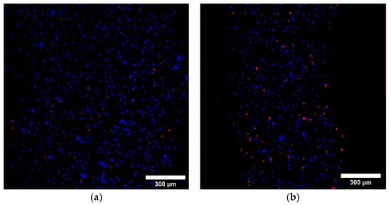 Live/dead fluorescence images (10× magnification) of (a) 3/4 Alg/Gel and (b) 3/7 Alg/Gel bioinks measured immediately after extrusion. Blue color represents all cells, alive and dead, stained with Hoechst 33342, and red color represents propidium-iodide-stained dead cells. The scale in both figures is 300 µm.