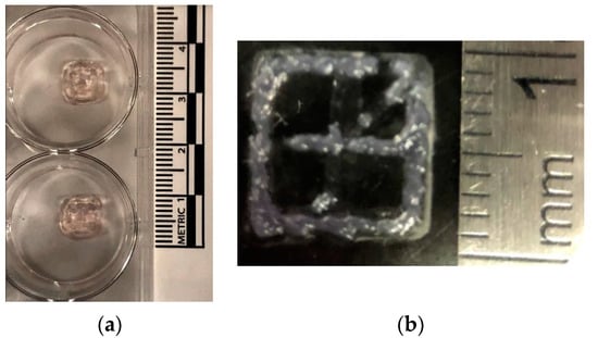 Constructs directly after printing onto tissue-culture treated well plate surfaces (a) 3/4 Alg/Gel and (b) 3/7 Alg/Gel. The scale in both pictures is 1 cm per unit length.