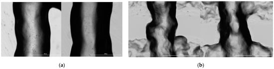 Brightfield images at 4× magnification of (a) 3/4 Alg/Gel and (b) 3/7 Alg/Gel filaments directly after extrusion. The scale bars depict 1000 µm.