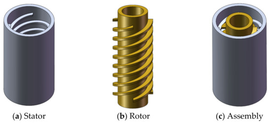 The main components of the labyrinth screw pump were a rotor and stator pair machined with opposite threads, and a radial clearance of 0.1–0.4 mm was left between the rotor and the stator. When operating, the rotation direction of the rotor was opposite to the direction of its own thread. The spiral groove of the labyrinth screw pump was very shallow, and the fluid produced a horizontal or longitudinal vortex in the stator and rotor grooves during the flow. A labyrinth pump mainly relies on the vortex in the groove to realize the momentum transfer of the fluid between the stator and the rotor [14]. Figure 1 shows a schematic diagram of the structure and assembly of the stator and rotor in the pump.
