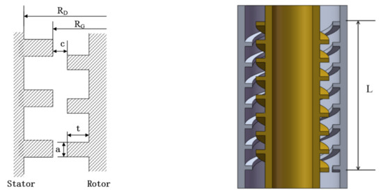 The operation parameters of the labyrinth pump studied were as follows: rotary speed N = 3000 rpm, volumetric flow rate Q = 4.17 m3/h, and hydraulic head H = 17 m. The geometric parameters of the rotor and stator are shown in Table 1. Figure 2 shows a schematic diagram of the main geometric parameters of the stator and rotor.
