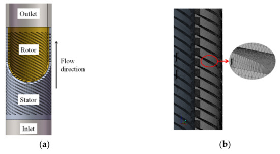 (a) Model of stator and rotor fluid domain and (b) partial mesh section view.