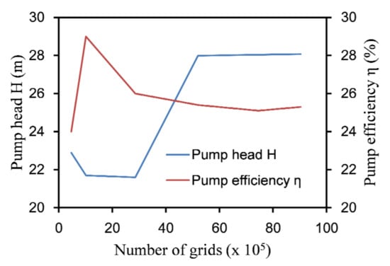 Due to the special structure of the labyrinth screw pump, the pump head and efficiency have a close relationship with the size of the stator and rotor gap. The finer the grid is, the more it can capture the influence of the stator and rotor gap on the pump performance. Therefore, when the resolution of the grid increases, the lift and efficiency of the model pump will fluctuate. Figure 4 shows that when the total number of grid cells was 5,198,481, the pump lift and efficiency tended to be stable. At this time, the numbers of grid cells of the inlet section, outlet section, rotor, and stator were 514,273, 518,554, 2,501,373, and 1,664,281, respectively.