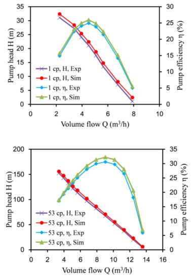 To verify the correctness of the numerical simulation method, it was compared with the experimental data of the rectangular labyrinth screw pump of Jiangsu University [20,21]. The speed was 3000 rpm. The physical properties of the medium were water and oil. At room temperature, the density of water was 997 kg/m3, the viscosity was 1 cp, the density of oil was 1203 kg/m3, and the viscosity was 53 cp.