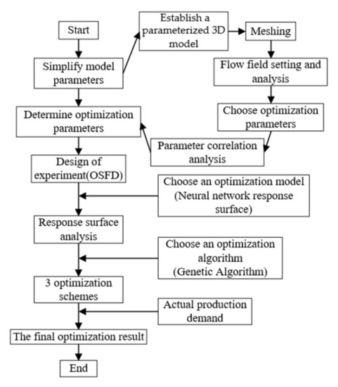The head H of the labyrinth pump and the efficiency η were selected as the optimization targets of the response surface optimization. The specific process is shown in Figure 6. First, a parameterized three-dimensional model of the spiral labyrinth pump was established in UG. The structural parameters of the model pump were identified and controlled through the parameterization function of the ANSYS Workbench, and the target function that needed to be output in the fluid calculation module was set to establish correspondence between the structural parameters and the objective function. An optimal space-filling design (OSFD) was used to determine the required test points. The test points were calculated one by one under the response surface module, and the structural parameters were fitted in the response surface optimization module using the obtained test data. The mathematical model relating the efficiency and head was an optimization model based on the response surface. On this basis, the multi-objective genetic optimization algorithm was used to obtain a series of solutions that met the requirements based on the model, and one of the solutions was selected as the final structural optimization size according to the actual engineering needs [22,23,24].