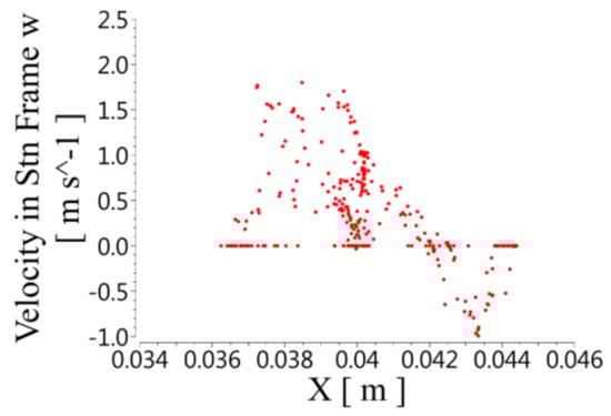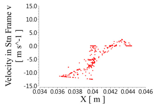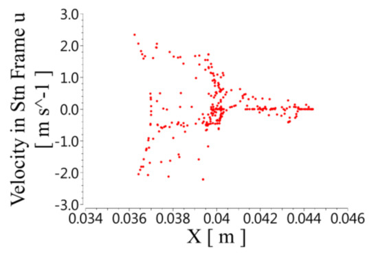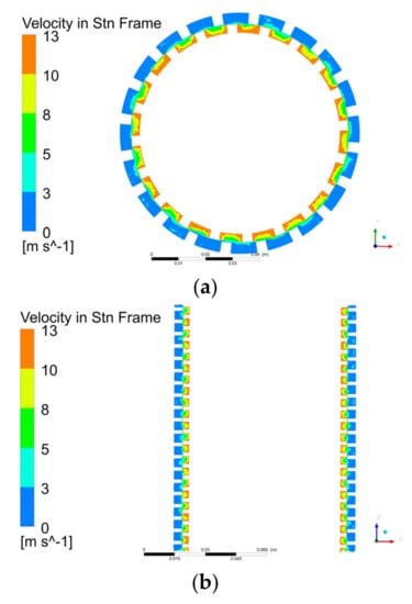 Figure 8 shows the radial velocity distribution. The positive values of the speed correspond to centrifugal motion, and the negative values correspond to centripetal motion. The centrifugal and centripetal motion occurred in both the rotor and the stator, so the fluid in the stator and the rotor formed vortices in the radial direction. The radial velocity was unevenly distributed along the axial direction. The speed was highest when it was close to the wall of the rotor and gradually decreased with the increase in the radius. The radial velocity at the bottom of the stator slot was close to 0.