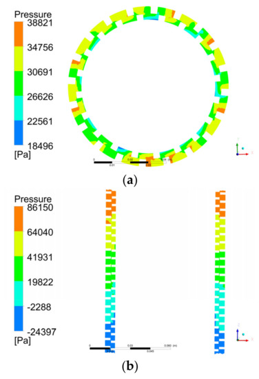 Figure 11a shows the pressure distribution in the pump on the XY plane. The liquid pressure gradually increased in the radial direction. The liquid pressure was highest at the bottom of the stator and lowest at the bottom of the rotor. This was because the oil obtained a higher kinetic energy in the high-speed rotating rotor. When the fluid entered the stator from the rotor, it was blocked by the stationary wall of the stator, and part of the kinetic energy was converted into pressure energy. Therefore, the fluid pressure in the stator was higher than that in the rotor. This was consistent with the conclusion obtained from the velocity analysis in Section 5.1.1, that is, the fluid velocity in the low-pressure area was relatively high.
