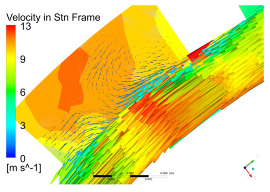 The spiral groove of the labyrinth pump was very shallow, and the centrifugal force was small. Therefore, the labyrinth pump mainly relied on the turbulent shear force of the fluid in the rotor and stator to increase the radial pressure difference between the rotor pressure surface and the stator suction surface. This allowed the fluid to generate a radial flow from the rotor to the stator. Furthermore, as shown in Figure 12, part of the fluid in the stator flowed back into the rotor due to the radial pressure difference between the stator pressure surface and the rotor suction surface, thereby forming a radial vortex in the stator. Because of the radial vortex, the fluid in the labyrinth pump periodically transferred the momentum of the fluid in the rotor to the fluid in the stator and then repeatedly entered the rotor to obtain energy. Therefore, the labyrinth pump mainly relied on these vortices to realize the momentum transfer between the fluid in the rotor and the fluid in the stator. The frequent energy conversion of the liquid in the pump led to an increase in the pump head, but it also produced a large amount of energy loss. Therefore, the flow and head curve of the labyrinth pump was steep, and the pump efficiency was low.