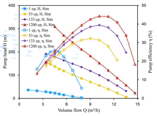 Performance comparison of labyrinth pumps at the best working point under different viscosities.