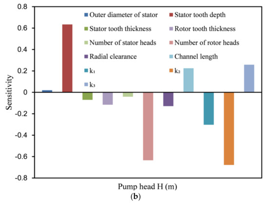 Sensitivity analysis results of design parameters for the (a) labyrinth pump head and (b) efficiency.