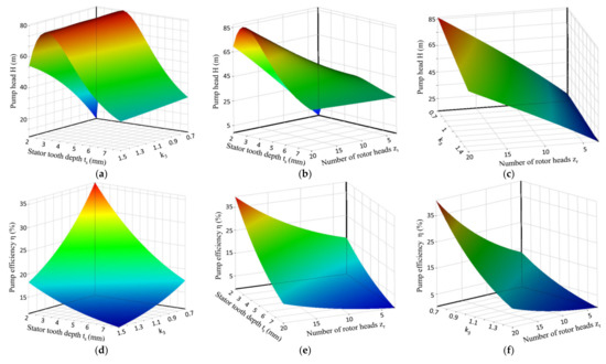 Based on the response surface results, the effects of combinations of different input parameters on the objective function were examined, and the value ranges of the optimization results were determined according to the response surfaces [28]. Due to the excessive number of input parameters in this study, the influences of the interactions between the stator tooth depth ts, the number of rotor heads zr, and k3 on the model pump head and efficiency are presented as an example.