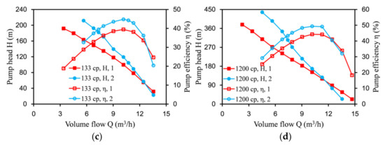 Figure 14 shows the variation of the head and efficiency with viscosity at the best efficiency point. When the oil viscosity was less than 133 cp, the efficiency increased faster, from 25.94% for 1 cp to 39.45% for 133 cp, corresponding to an increase of 52.1%. When the viscosity of the medium continued to increase, the increase in the efficiency dropped sharply. The efficiency increased from 39.45% for 133 cp to 44.26% for 1200 cp, corresponding to an increase of only 10.87%. When the viscosity continued to increase, the efficiency gradually leveled off. The variation trend of the head was the same as the efficiency. After the optimization, the head increased faster when it was less than 133 cp, from 27.14 m for 1 cp to 119.21 m for 133 cp, corresponding to an increase of 339.24%. When the viscosity continued to increase, the growth rate of the head decreased. The head increased from 119.21 m for 133 cp to 168.36 m for 1200 cp, corresponding to an increase of only 41.23%. All of these results indicate that the labyrinth screw pump is more suitable for conveying viscous media than clean water.