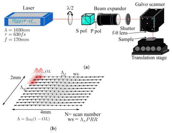 By rotating the internal mirrors inside the galvo scanner, several pulses are deposited with a spacing through numerous X direction scans, forming a 2 × 4 mm rectangle (as depicted in Figure 1b). The relatively large area of inscrption is to ensure a meaningfull roughness measurement. Once the inscriptions are finished, they are cleaned in an ultrasonic bath with water at room temperature.