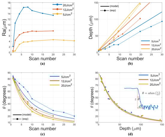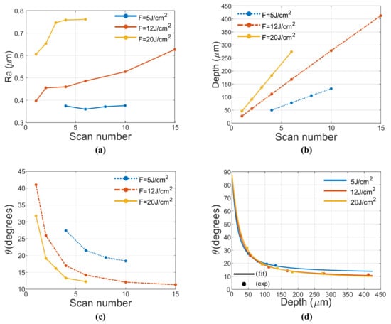 Where is the number of pulses per line, is the number of lines, i and k are integers. For 90% OL, the approximate number of pulses per beam diameter is 20, whose threshold has already been experimentally calculated using the well known D-square method [22], being J/cm, this agrees well with existing literature [23]. By adjusting Equation (3) to the experimental values, the parameter nm was found. With this parameter, depth and taper angle were calculated and compared to experimental values as depicted in Figure 2b,c. Here the results slightly deviate for low fluences but for high fluence (20 J/cm) they agree with the model. Overall, the experimental values exhibit lower depth than theoretic values. This might be attributed to multiscan engraving scheme, where the pre-formed surface structure by earlier scan will influence the subsequent scan. This might lead to less efficiency. As depth increment is linear with the number of scans, it is possible to plot taper angle against depth as depicted in Figure 2d. In this way, an arctan relation is observed. This is explained by a transition region d that is approximately constant with number of scans.