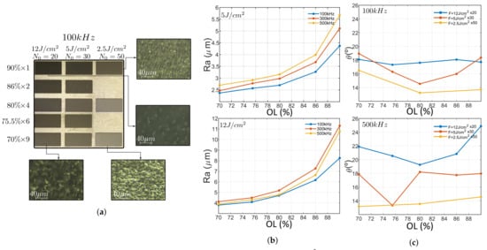 In terms of surface roughness, behavior is strongly dependent with overlap. Here, high OLs (>85%) exhibit a local maximum at 50 kHz while low OLs (<75%) exhibit a local minimum at 100 kHz, intermediate OLs exhibit a monotonic decrement of surface roughness. This tendency is depicted in Figure 6 for 12 J/cm but this trend is also accomplished at both lower and higher fluences. As an example, center plot shows 90% OL at 5, 12 and 20 J/cm. All the fluences exhibit a local maxima at 50 kHz and follow the same trend, being roughness higher at higher fluences, regardless the lower number of inscriptions performed. It is also noteworthy that at 200 kHz, 90 and 75% OLs exhibit higher roughness compared to intermediate values. This trend can be also seen at other fluences as the correct graphs suggest, being 86% the overlap with lowest roughness for the three studied fluences. This trend is also followed by depth and taper angle. Depth exhibits a local maxima at 86% for all repetition rate, being it more pronounced with the increase of PRR. As expected from Section 3.1, the taper angle behaves inversely proportional to the depth, hence exhibiting a local minimum.