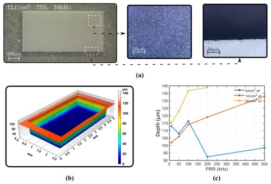 Square inscription at 12 J/cm, 75% overlap and 10 kHz PRR written 24 times (a). Surface profile of that same rectangle with confocal microscope (b). Depth of rectangles with repetition rate for different fluences (c).