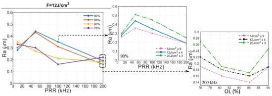 Roughness plot of inscribed rectangles at 12 J/cm against PRR at different OLs (left). This tendency is consistent at different fluences, as the plot in the middle suggest, where OL is fixed at 90% and the Ra is plotted at different fluences. Low roughness is achieved at 200 kHz for all OL (with 86% a local minimum at all fluences), as shown in the figures on the right.