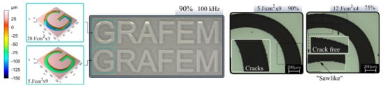 Figure 7 shows a microscope image of 20 J/cm and 5 J/cm for 90%. Additional artifacts are appearing in logo engraving, it is clear that higher fluence produce defects, debris and irregular surface as depicted in confocal microscope image. If lower fluences are employed, the result becomes much more smooth but longer process time (274 s while 20 J/cm takes 72 s). Moreover, a careful inspection of the engraving reveals micro-cracks at all the fluences for 90% OL. Micro-cracks can appear along specific crystal axis [25] during ultrafast laser machining due to its anisotropic mechanical strength, in our case, the micro-cracks appear to associate to scanning strategy, or OL, the reason this is so has to be further investigated in the near further. Microscope image of Figure 7 (right) shows a magnified part of the G letter for 5 J/cm. There are no signs of microcracks, but edges exhibit a sawlike profile. This effect is attributed to the high separation between pulses that leaves zones without proper irradiation. This results suggest the use of moderate fluences and overlaps to achieve engravings with best trade off quality.