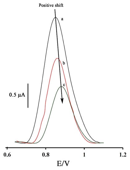 DP voltammograms of ds-DNA/SWCNTs/GCE in the absence (a) and in the presence of 7.0 µM (b) and 14.0 µM (c) doxorubicin, respectively.