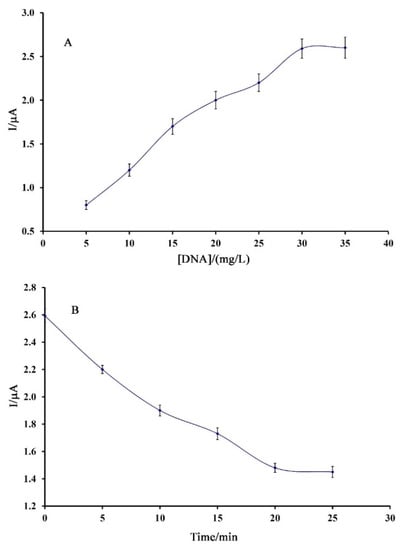 In addition, intercalation time between 30.0 mg/L ds-DNA and 7.0 µM anticancer drug was optimized as one of the main factors in the ability of the sensor for trace-level analysis of doxorubicin in the period time 0–25 min. As can be observed, with increasing the time until 20 min, the oxidation current of guanine reduced and then remained stable (Figure 2B). This referred that 20 min was sufficient for intercalation between analytes and ds-DNA.