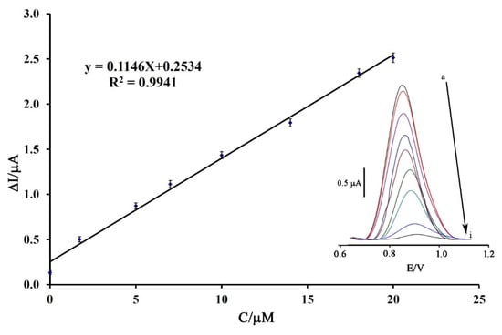 DP voltammograms of ds-DNA/SWCNTs/GCE in the presence different concentrations of doxorubicin were recorded and represented in the inset of Figure 3. As can be seen, the oxidation current of the guanine base displayed a linear dynamic range in the concentration range 1.0 nM–20.0 µM for sensing of doxorubicin at the optimum conditions (Figure 3). Moreover, the findings indicated that the ds-DNA/SWCNTs/GCE could be successfully utilized for the determination of doxorubicin with a limit of detection (LOD) of 0.6 nM (YLOD = 3 Sb/m; Sb is the standard deviation of blank and m is the slope of linear dynamic range). The linear dynamic range and limit of detection of the proposed biosensor were comparable with previous electrochemical suggested sensors for monitoring of DOX (see Table 1).