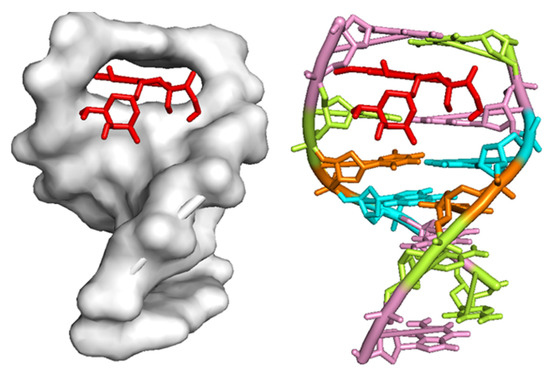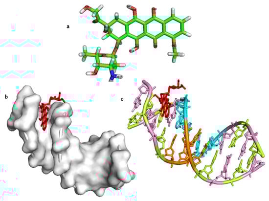 The binding affinity of doxorubicin (DOX) drug inside the DNA receptor was theoretically assessed in two manners: Groove interaction and intercalation. For those, DNA structures with base pairs sequences dodecamer d(CGCGAATTCGCG)2 (PDB ID: 1BNA) and hexamer d(CGATCG)2 (PDB ID: 1Z3F) were used. The best conformations of DOX-DNA docked models with the lowest binding affinity are visualized in Figure 4, Figure 5 and Figure 6.