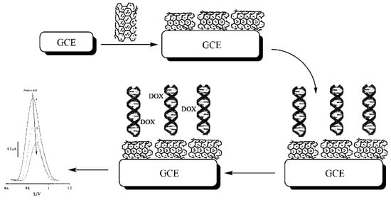 Electrochemical strategies showed many advantages for sensing of biological, anticancer drugs and a wide range of electroactive materials due to easy operation, fast response, high sensitivity, and portable ability [20,21,22,23,24,25]. Furthermore, the electrochemical sensors are considered to be more efficient and sensitive than other methods due to the opportunity to be boosted using various modifiers [26,27,28,29]. As a result of these considerations, numerous teams have reported electrochemically modified sensors for DOX monitoring [15,30,31,32]. However, the low selectivity issue is still one of the most important obstacles of electrochemical sensors for the detection of DOX. Due to the specific reaction, biological recognition elements, such as DNA, can be used to overcome this issue [33,34].