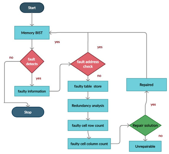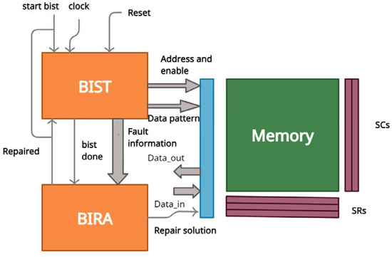 Furthermore, the memories are more prone to faults than the actual logic, as memories do not consist of the logic elements such as flip-flops [3,4], and the defects in the embedded memory of the devices or the systems can cause a critical error. Therefore, regress testing embedded memories in today’s complex SoC-based systems becomes necessary to retain the products’ reputation in the market. Thus, the SoC-based product yield is drastically affected by the memory in the chip. The effective yield-improvement method becomes essential for SoC design. Testing memories for faults and repairing defected memory methods play a vital role in improving the SoC design yield [5]. Memory-fault test and repair are popular techniques for yield improvement [6], and the built-in self-repair (BISR) is a widespread scheme to enhance the yield of the memory-based product.