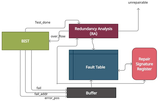- Once the BIST programs failure information, the repair process starts. The RA block reads the faulty addresses and compares them with the addresses previously available in the fault table. If an address is not previously known, it stores it into the fault table; otherwise, it ignores it.