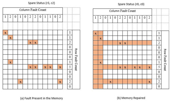 The proposed repair algorithm workflow can understand by the example taken for a faulty memory shown in Figure 5. The presented approach uses three rows and two columns to repair the memory. The spare status before the repair process starts (r3, c2) and is shown in Figure 5a. The algorithm will first calculate the row-fault count and the column-fault count and then allocate the spare rows and columns as described in the flow. The spare row and spare column allocation are shown from the example and can be seen in Figure 5b. The memory will repair once it performs all the steps of the BISR flow. The same BISR block will share within the multiple memory by selecting one after another.