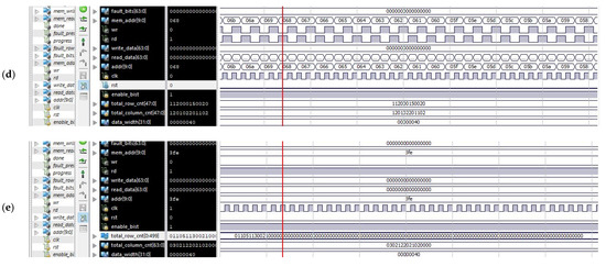 Simulation results for the proposed BISR block: (a) writing memory with all 0s; (b) BISR operations for performing read–write operations into and from memory; (c) BISR operations fault and type detections and store fault information; and (d) BISR flow and fault count detection row–column wise and memory repair for 8 k memory. (e) BISR flow and fault count detection row–column wise and memory repair for 16 K memory.