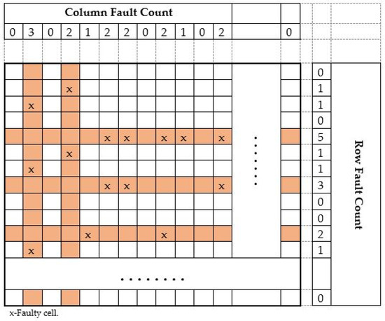 The row and the column count for the detected faulty cell are shown in Figure 7. The defective cells are indicated in the table by the cross (x) indicator. The total fault count in a row and the total fault count in a column are calculated and written in the fault count’s appropriate place for two memories of sizes 8 K and 16 K. It can be seen from the simulation result in Figure 6d,e respectively. The fault count comparison is performed for selecting only the row or the column with a higher fault count. When fault row count and fault column count are equal, the fault row repair will be fixed and assigned with a redundant row. If there is only one fault in a particular row or a particular column, the row repair will select and set for a redundant row. The chosen memory is repaired by the steps mentioned in the flow. The spare row and the spare column are (3, 2) used to fix the memory under test for fault.
