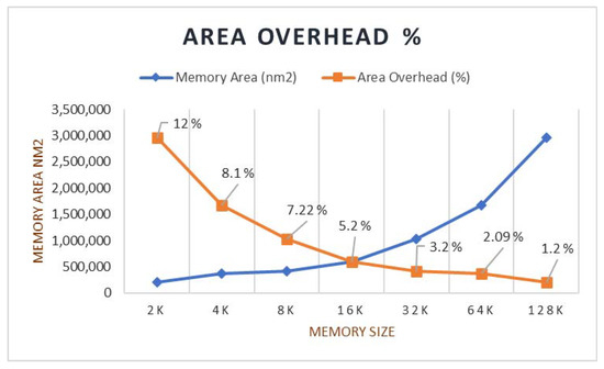 The test was conducted on the significant memories of 8 k, 16 k, 24 k, 32 k, 64 k, and 128 k sizes. The area overhead percentage was calculated, and the obtained results are tabulated in Table 10. The graph for the overhead rate is plotted as shown in Figure 9.