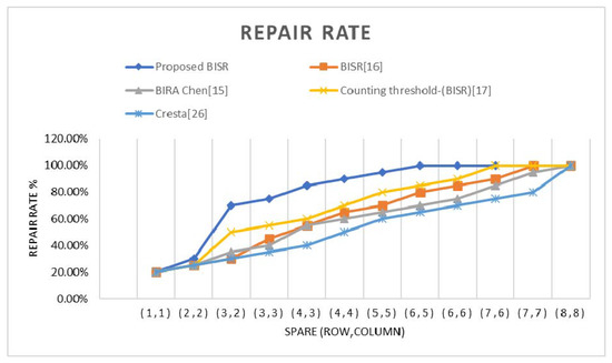 The proposed BISR block in this research study aims to enhance the area overhead, timing, and repair rate. The other existing BISR approaches of the studies [15,16,17,26] are compared with the presented scheme of the BISR module and found with a large spare row–column matrix, the repair rate is reasonable, and the area overhead is reasonably higher. It is noticed that, from the obtained results, the repair rate and area overhead for the proposed BISR scheme is better with the discussed existing approaches with the use of three spare rows and two sparse columns. The area, timing, power, and repair rate are given in the results section. We have noticed from the repair-rate graph that the repair rate increases with the increase of spare row–column.