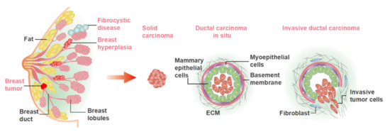 Breast diseases are derived from breast glands, fat, lymph, blood vessels, nipples and other breast-related tissues, including breast inflammatory diseases, benign breast lesions, breast malignant tumors, congenital abnormalities, and male breast development. The common breast diseases are illustrated in Figure 1. Bacterial/viral infections and the cellular carcinogenesis are two mainly causes of breast disease. At present, the treatment principle of breast disease is to remove the cause, treat symptomatically, reduce recurrence, and improve survival rate and quality of life after treatment. Many females lose breasts due to breast disease, especially breast cancer. Therefore, it remains important to fabricate the novel models for research and therapeutic approaches to breast diseases.
