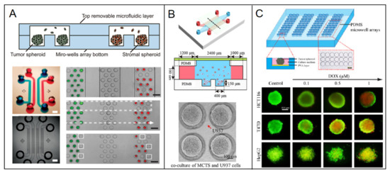 Homotypic spheroid is a conventional model for 3D culture because it is convenient to fabricate. Breast cancer cell lines are commonly used to construct spheroid, including high invasive MDA-MB-231, BT20, low invasive MCF-7, Hs578, Hcc1937 and noninvasive MCF-10A. Liang Zhao et al. [12] aggregated breast tumor cells of MCF-7 and fibroblast cells, respectively, to prepare diverse homotypic spheroids in a top-removable microfluidic device and analyze different spheroids on a single device (Figure 2A). Hildegonda P.H. Naber et al. [13] generated homotypic MCF-10A spheroid cell cultures embedded in a 3D collagen matrix in vitro to study TGF-β-induced invasion. Cancer stroma and the extracellular matrix (ECM) are the important factors for cancer progress, including few fibroblasts, mesenchymal cells and collagen, elastin, fibrin, fibronectin, respectively [14,15,16]. Therefore, stroma cells and ECM were considered by neighboring them or embedding into the spheroid respectively to enrich the microenvironment in in vitro models. Tianying Yuan et al. [17] developed a microfluidic chip-based 3D breast cancer model by co-culturing monodisperse breast tumor spheroids aggregated by T47D or MDA-MB-231 with monocytes in a 3D collagen matrix to investigate macrophages and ECM effect on tumor cell migration (Figure 2B). Personalization is a developing trend in biomedicine. Primary cells are the best choice to include in the drug-delivery system and models. Manuela Cipolletti et al. [18] exploited a novel anti-estrogen discovery platform using primary breast cancer cells to identify new Food and Drug Administration (FDA)-approved drugs inhibiting E2:ER signaling to cell proliferation. Yongli Chen et al. [19] developed a microwell array microfluidic system to form diverse spheroids of breast cancer cell T47D and other human cancer cell lines of HepG2 and HCT116 for drug susceptibility testing and offline drug signaling pathways. The response of doxorubicin and paclitaxel on different types of spheroids were simultaneously performed in the system (Figure 2C). Although the microenvironment is partly ignored inside a homotypic spheroid, this could be remedied by modifying the environment adjacent to the spheroid. Therefore, it is still a common model for cancer research, and it provides a basis for other researches due to its simple preparation, such as imaging technology [20], dynamic self-assembly [21], intratumoral microvessels [22], and drug delivery [23]. Also due to the controllable and high efficiency in preparation, homotypic spheroid has excellent potential to promote industrial applications in the future.