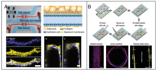 The lumen models in breast tumor-on-a-chip. (A) A stable hemi-channel mammary duct was formed on the spatially modified COL1 hydrogel under optimized coating condition. [37] Open access. (B) A mammary duct was fabricated on an extracellular matrix (ECM) lumen hollow, which was fabricated by presetting and pulling out of a polydimethylsiloxane (PDMS) rod [41]. Open access.