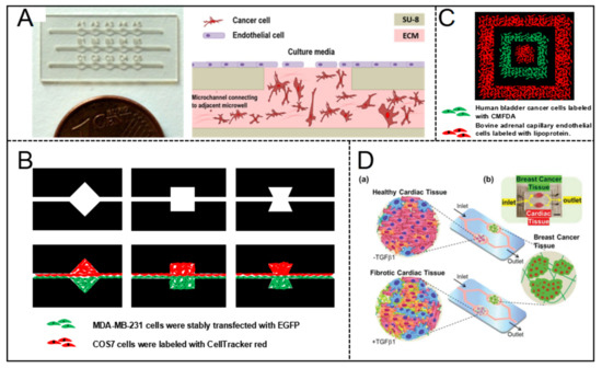 Yu-suke Torisawa et al. [49] described a sandwich microfluidic with a semi-porous membrane to form patterned co-culture model. Arbitrary cellular arrangements were enabled by regulating the geometric features of the bottom channel and flow hydrodynamics. Patterned co-culture models with various geometries and compositions were fabricated successfully (Figure 4B).