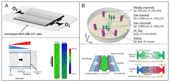 Hypoxia model in breast tumor-on-a-chip. (A) The gradient of oxygen concentration was established in microfluidic chip by cellular oxygen consumption in the relatively closed spaces [71]. Open access; (B) A linear oxygen gradient from 3% to 17% was generated through the oxygen permeability of ECM. The response of breast cancer cells to different oxygen tension was investigated using the hypoxia microfluidic system [72]. Open access.
