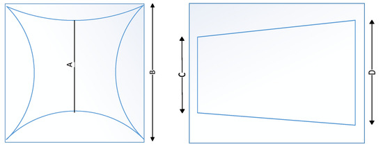 Section 2.1, it is clear that when applying the MEMS micromirror for planar scanning, the scanning effect is affected by the angle of the incident light and the mechanical deflection angle of the vibrating mirror. From Equation (11), the distribution of scanning points in the scanning plane thus produces a distortion effect; from Equation (12), the deflection angle of the outgoing light also presents a distortion effect. The resulting distortion effect can be divided into two categories, namely pillow distortion and skew distortion. The rough distribution profile is shown in