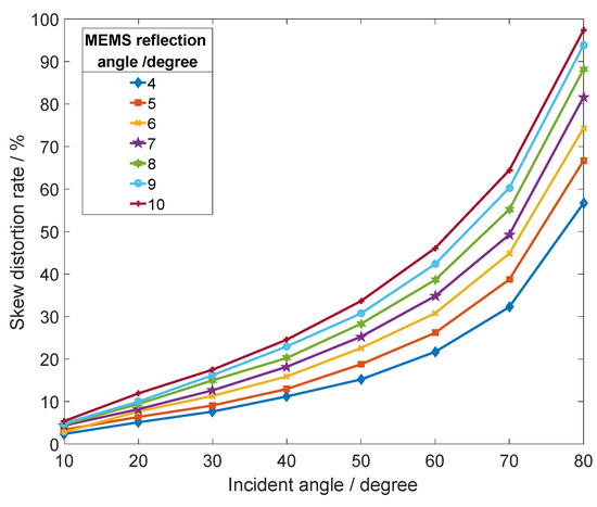 To study the effect of skew distortion at different MEMS deflection angles and different incident angles, the micromirror deflection angle and light incident angle are changed, respectively, to obtain the skew distortion curve shown in