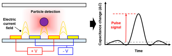 The capacitive sensing technique on a microfluidic platform to measure the variations generated by particles is mainly based on the contrast of dielectric properties (e.g., permittivity and conductivity). By placing the electrodes close to the particle matter trajectory, the particles passing through the detection region are inevitably affected by an AC electrical field. Based on this phenomenon, such variations are directly related to the interaction of the created electric field as well as the occupied volume fraction between the matter and medium in the detection region. Therefore, in this study, the presence of MPs is displaced by the equivalent capacitance and measured as a positive pulse, as illustrated in Figure 1. Our particle detection element was performed using an LCR meter, which is a high-precision instrument, rather than a lock-in amplifier, owing to its interface convenience. The capacitance variations can be equivalently calculated by measuring the impedance of the capacitor.
