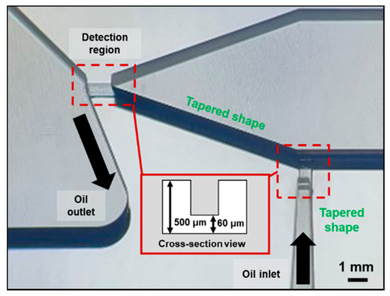 For stable microcirculation of the viscous liquid (oil), we designed the overall structure of the microchannel to be rectangular in shape with a low aspect ratio (6000 μm × 500 μm) [40]. Based on the geometrical structure with margins, it allows precise flow control and enhances the stable operation. As an exception, only the dimensions of the required points (detection region and inlet of the oil microcirculatory system) were determined to be relatively low (2000 μm × 60 μm × 400 μm), as illustrated in Figure 4. Of the two points, the detection region was made to allow the particles to pass through closely to the particle detection element, and it occupied a large fraction of the sensing volume [41]. The other was matched with the dimensions of the detection region to minimize excessive mismatches in the flow rate of the microcirculation between the oil inlet and outlet. For each entrance line, the structure was designed in a tapered shape to avoid bottlenecks. It induces the incoming particles to the detection region to accelerate and pass through quickly. Because this microchannel is MEMS-compatible and easily fabricated, synergies can be obtained depending on the architecture of the microfabricated electrodes.