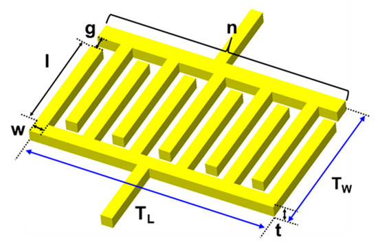 Various studies have attempted to determine the optimal dimensions of electrodes using finite-element simulations validating that the shorter the distance between the electrodes, the larger the electric variations produced by the particles [30,44,45,46]. This is because the electric field line creates a strong boundary between the electrodes. Although the effect of geometrical optimization tends to be saturated, the order of the measured values changes considerably in terms of performance enhancement. For our microfluidic platform, the geometric design factors of planar electrodes need to be determined with data sampling frequency and particle residence time to detect the particles passing through the detection region in a short time. The design values of the required sensing area can be theoretically derived based on the determined flow rate of the working fluid and the geometric structure of the microchannel. Here, simply extending the distance between the electrodes would lower the intensity of the electric field. A single pair of coplanar electrodes could not sufficiently detect the particle behavior without increasing the applied voltage. Therefore, as illustrated in Figure 5, we adopted a shape for the electrodes, namely, several interdigitated pairs. The finger gap () and width (w) of the IDEs were 20 and 40 µm, respectively. They are the minimum linewidth and gap that can be achieved with the conventional lithography process using the film mask we have used. The finger length (l) was 390 µm. The width of the detection region and the finger length was matched so that the particle was affected by the electric field as soon as the particle enters from the entrance of the detection region. The number of fingers (n) was 13, chosen to ensure a sufficient sensing area. To detect at least two points or more with the sampling rate while the particle passes through the sensing volume, the sensing area was expanded with several pairs of fingers. The thickness of the electrodes were determined to be 0.21 µm to prevent unexpected bonding issues owing to the high flush between the microelectrodes and the microchannel [47]. Accordingly, the design values of the total electrode length () and width () were 1480 µm and 490 µm, respectively. The design factors of the IDE are listed in Table 1.