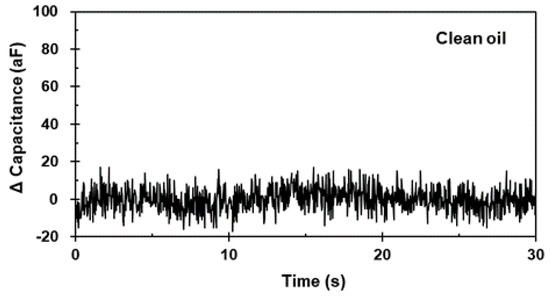 Firstly, the test was performed in clean oil conditions without particle particles to ensure a noise floor level. Figure 8 presents the capacitance signal results for the clean oil conditions. Outlier signals, such as a peak signal, were not detected. The result shows a stable noise floor level, and a peak signal is not generated where the particle did not exist in the detection region.