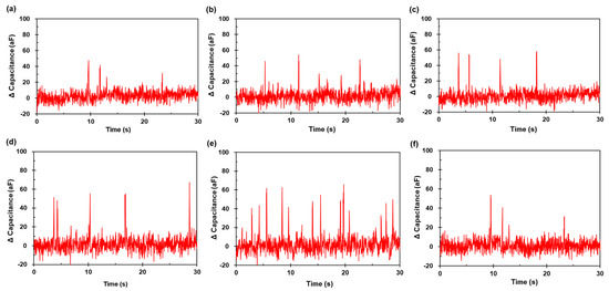 The test was conducted by sweeping the excitation frequency, because the dielectric properties depended on the applied AC frequency. Figure 10 presents the capacitance signal results for the 20 μm aluminum particles under different frequencies with 0.2 MHz intervals. The measured capacitance signals () generated by each particle were identified using the recorded optical synchronization. The positive pulse immediately occurred as soon as the particle crossed the detection element. The data sampling rate was appropriate for tracking the particle trajectory. The amplitudes ranged from 31 aF to 47 aF (Figure 10a), 30 aF to 53 aF (Figure 10b), 43 aF to 57 aF (Figure 10c), 39 to 67 aF (Figure 10d), 38 aF to 66 aF (Figure 10e), and 31 aF to 53 aF (Figure 10f).