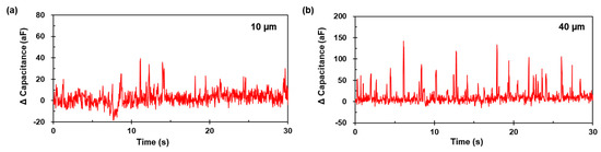 Figure 11 presents the capacitance signal results for the 10 µm and 40 µm aluminum particles at 1.8 MHz. The amplitude ranges from 20 to 37 aF (Figure 11a) and 30 aF to 142 aF (Figure 11b), respectively. The results indicate that the particle detection element could detect individual particle sizes from 10 µm to 40 µm. As the data sampling point was at least four, even for different particle sizes, the operational conditions were adequately determined, as presented in Figure 12.